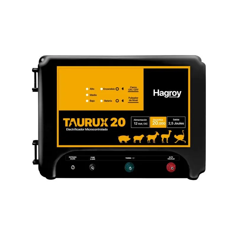 Cerco Electrico Ganadero 20KM Electrificador Energizador a Bateria Hagroy HG-TAURUX20K Los energizadores de la línea TAURUX son desarrollados exclusivamente para los cercos eléctricos de ganadería, es por ello que cumplen con total eficacia su funcionamiento, y cumplen con ensayos que exige la Comisión Electrotécnica Internacional IEC.