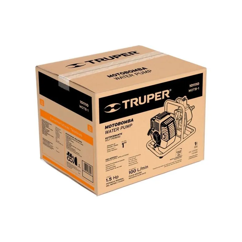 Motobombas 1" 1.3HP 110L Motor Gasolina 36cc 4T 25m Truper 102432 Ideal para sistemas de riego, bombeo de pozos, agricultura y construcción. Para zonas de difícil acceso a electricidad Se utiliza para trasladar grandes cantidades de agua limpia Altura máxima de bombeo: 25 m Flujo máximo: 110 L/min Máxima profundidad de succión: 8 m