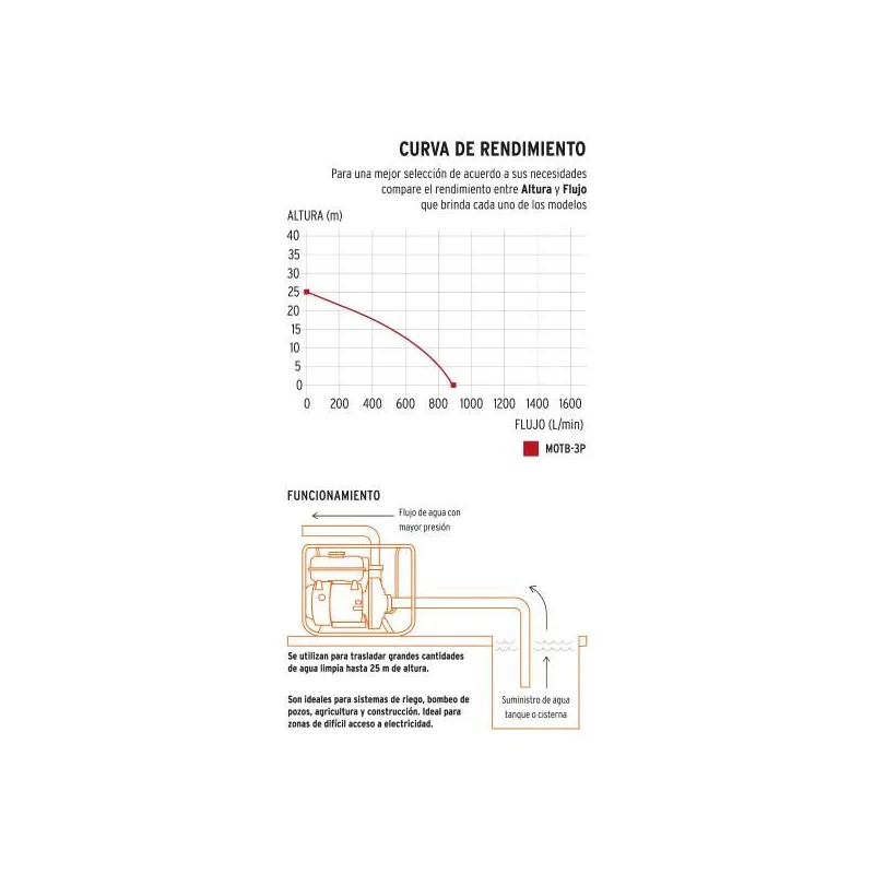 Motobomba 7 HP, 3" de Salida 900 L/min, Motor 4 tiempos, Altura Maxima 25 m, MOTB-3 17117 Truper Diseñada con chasis tubular de construcción durable, uso rudo y fácil transporte. Motor OHV (Over Head Valve, válvulas sobre la cabeza) a 4 tiempos para un alto desempeño, enfriado por aire, no requiere mezcla de aceite y gasolina. Arranque manual (cuerda...