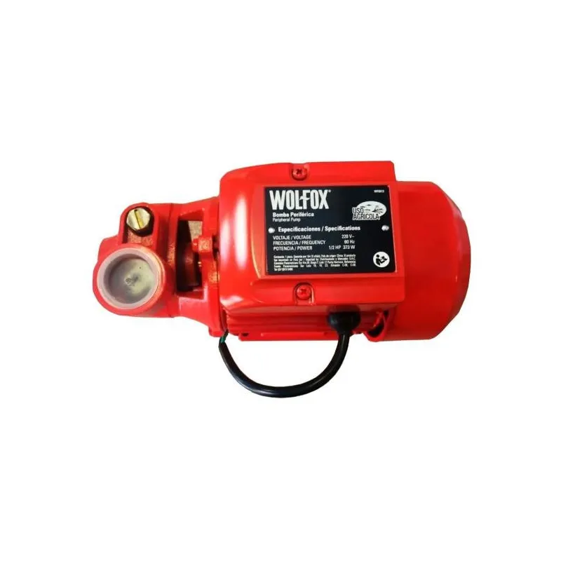 Bomba de Agua Perisferica 1" 1HP A28m P9m AutoCebantes 220V Wolfox WF1412 Bomba periférica autocebante 1/2 HP 220V. 220 V~ 60 Hz. Operación silenciosa. Impulsor de bronce. Entrada / salida de 1” NPT. Velocidad: 3,450 rpm. Para agua limpia. Altura màxima de 28 metros.. Profundida màxima de 9 metros. Flujo màximo de 40 L/min. Color: rojo.