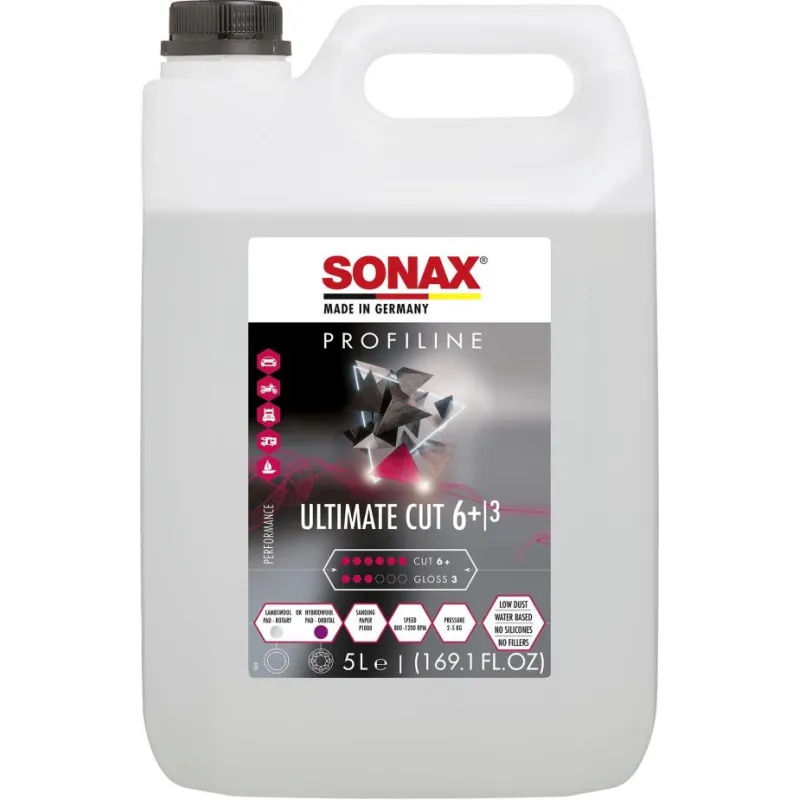 Sonax Profiline Ultimate Cut es un compuesto de corte rápido para pulir superficies lijadas o pintadas muy desgastadas, gelcoat y fibra de vidrio. Formulación inodora a base de agua con poco polvo y sin silicona. Elimina rápidamente marcas de lijado P1000 o más finas de pintura o gelcoat.