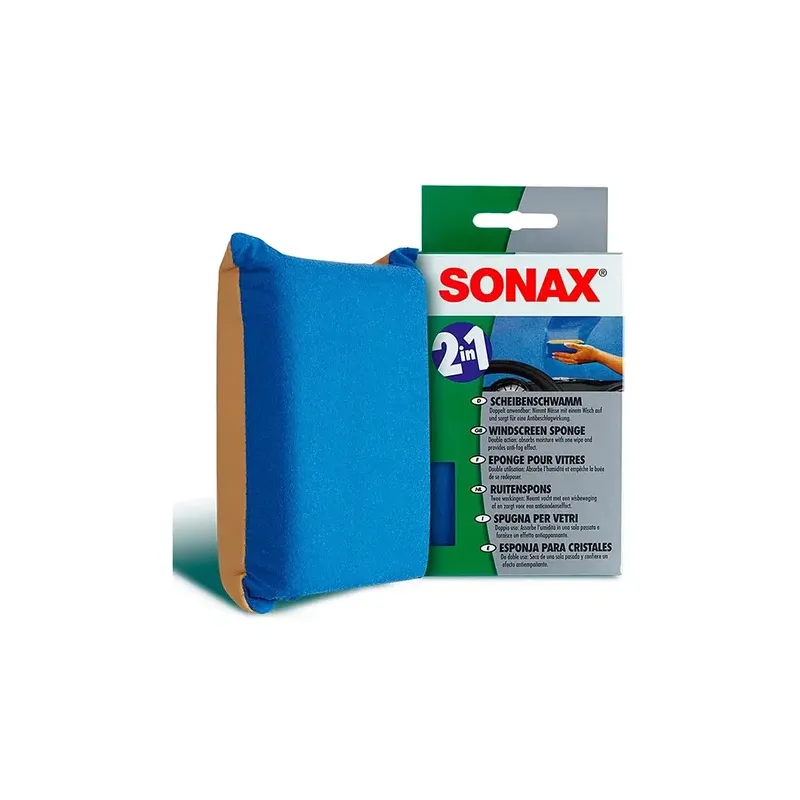 Esponja de doble propósito: cuenta con una gamuza de cuero en un lado y microfibra suave en el otro. El lado amarillo de la esponja absorbe eficazmente la humedad, dejando las superficies de vidrio limpia y sin manchas. El lado azul de la esponja proporciona un efecto antiniebla mientras elimina las huellas dactilares, manchas y aceites, dejando las superficies de vidrio cristalinas y sin rayas. Utilice con limpiacristales Sonax.