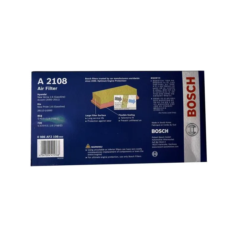 Filtro de Aire Kia HyundaI Rio Accent Verna Pride 272x140mm 28113-1G000, Bosch 0986AF2108
