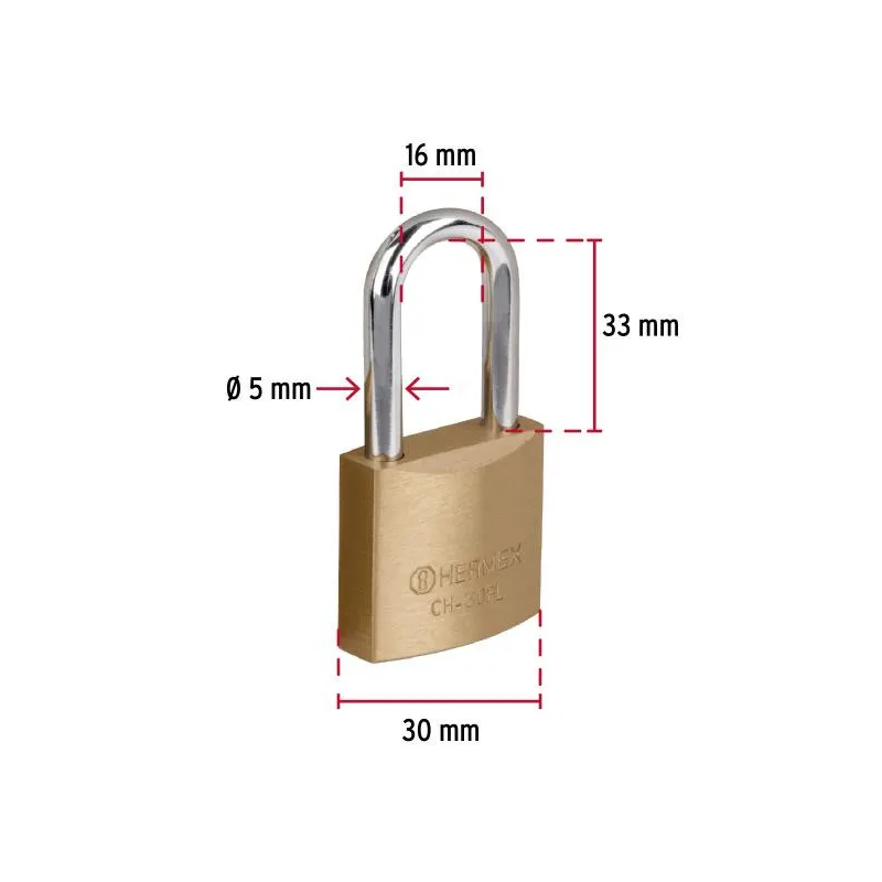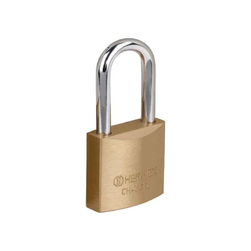 Candados 30mm S3 GanchoLargo 2llaves Hermex 23516 Cuerpo de latón sólido con acabado pulido y gancho largo de acero con acabado cromado Seguro tipo perno, seguridad estándar Cilindro de latón sólido con pines que brinda resistencia a robos Mecanismo interno resistente a la corrosión Llave y componentes de latón para mayor vida útil