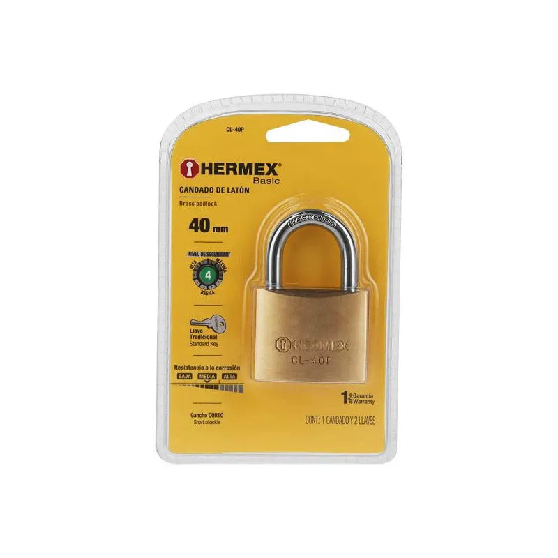 Candados 40mm S5 2llaves Hermex 43428 Cuerpo de latón sólido con acabado pulido y gancho corto de acero con acabado cromado Seguro tipo perno, seguridad estándar Cilindro de latón sólido con pines que brinda resistencia a robos Mecanismo interno de alta resistencia a la corrosión Llave y componentes de latón para mayor vida útil