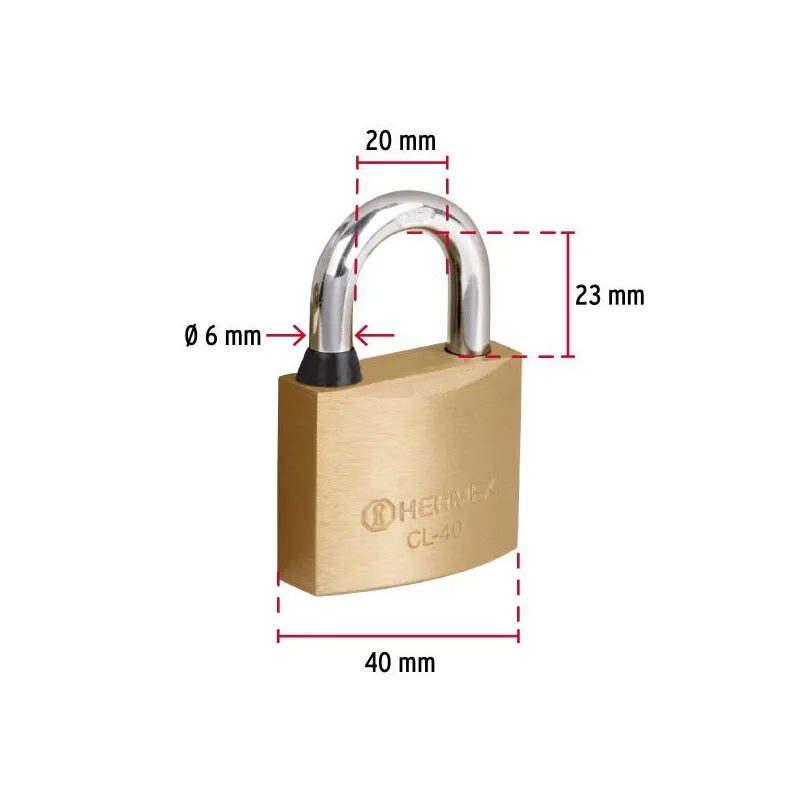 Candados 40mm S4 2llaves Hermex 23515 Cuerpo de latón sólido con acabado pulido y gancho corto de acero con acabado cromado Seguro tipo perno, seguridad estándar Cilindro de latón sólido con pines que brida resistencia a robos Mecanismo interno resistente a la corrosión Llave y componentes de latón para mayor vida útil