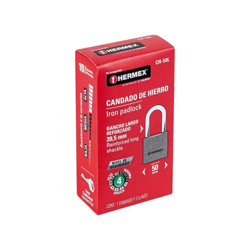 Candados 50mm S4 Hierro GanchoLargo 2llaves Hermex 43325