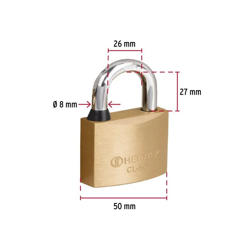 Candados 30mm S4 2llaves Hermex 43427 Cuerpo de latón sólido con acabado pulido y gancho corto de acero con acabado cromado Seguro tipo perno, seguridad estándar Cilindro de latón sólido con pines que brinda resistencia a robos Mecanismo interno de alta resistencia a la corrosión Llave y componentes de latón para mayor vida útil