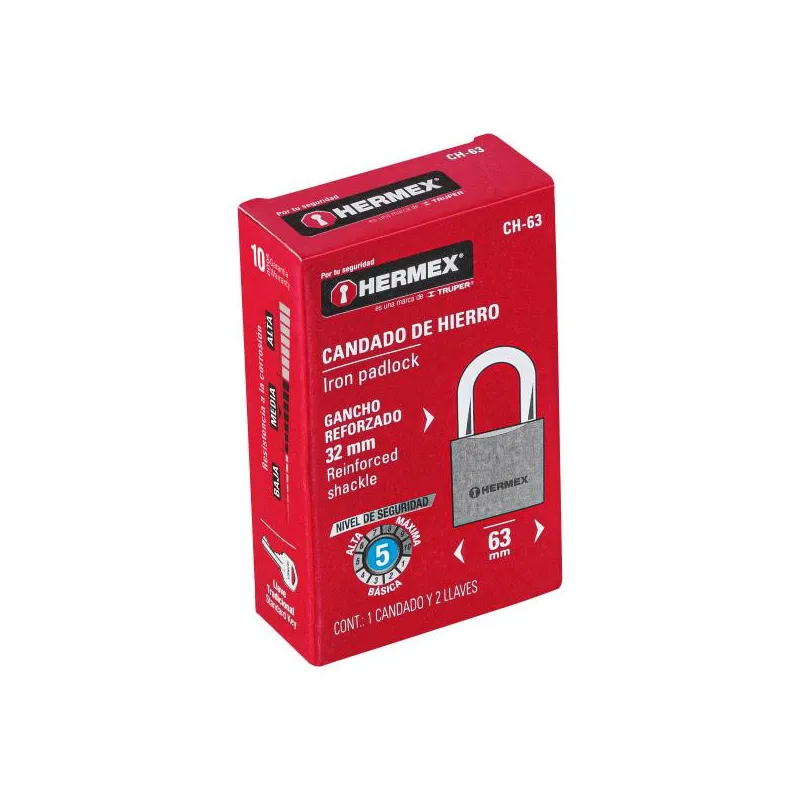 Candados 30mm S4 2llaves Hermex 43427 Cuerpo de latón sólido con acabado pulido y gancho corto de acero con acabado cromado Seguro tipo perno, seguridad estándar Cilindro de latón sólido con pines que brinda resistencia a robos Mecanismo interno de alta resistencia a la corrosión Llave y componentes de latón para mayor vida útil