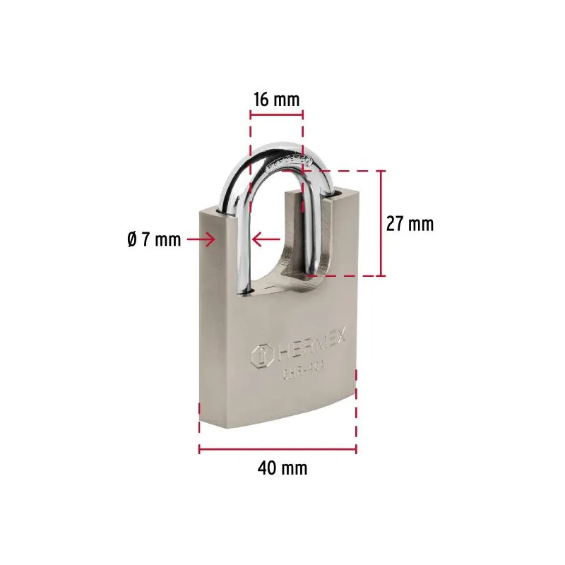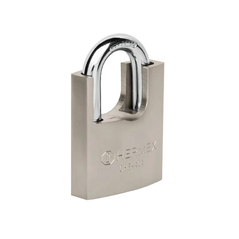 Candados 40mm S4 GanchoLargo 2llaves Hermex 23517 Cuerpo de latón sólido con acabado pulido y gancho largo de acero con acabado cromado Seguro tipo perno, seguridad estándar Cilindro de latón sólido con pines que brinda resistencia a robos Mecanismo interno resistente a la corrosión Llave y componentes de latón para mayor vida útil