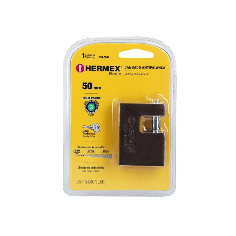 Candado Antipalanca 50mm Seguridad 7, cierre de balin incluye 2 Llaves tradicional, COR-50 43355 Hermex Cuerpo de latón sólido, acabado pulidoSistema antipalanca para mayor seguridadCilindro de latón sólido más durableGancho anti-robo con un recubrimiento especial que permite resistir actos vandálicos (cortes de segueta, corta pernos y...