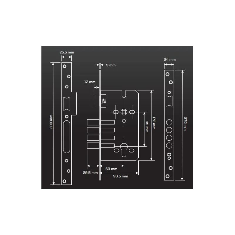 Cerradura de Embutir Forte Enigma 3G Onda DER Acero Inox 3Golpes 4Pivotes · 4 barras de acero cromado.· Triple Avance de seguridad.· Disco giratorio de acero que dificulta la vulneración con taladro.· Escudo de acero inoxidable 304.· Uso en puertas exteriores de madera principal.· Para espesores de puerta entre 40 mm. y 45 mm.· Medida de instalación de 60...