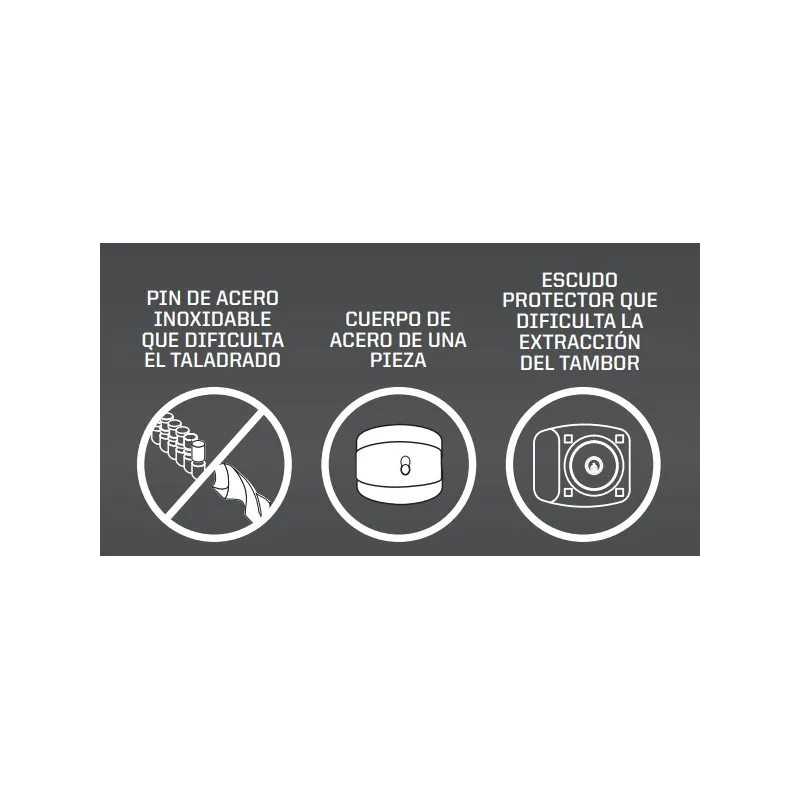 Contrapin y resortes de acero inoxidable que dificultan la vulneración con taladro.