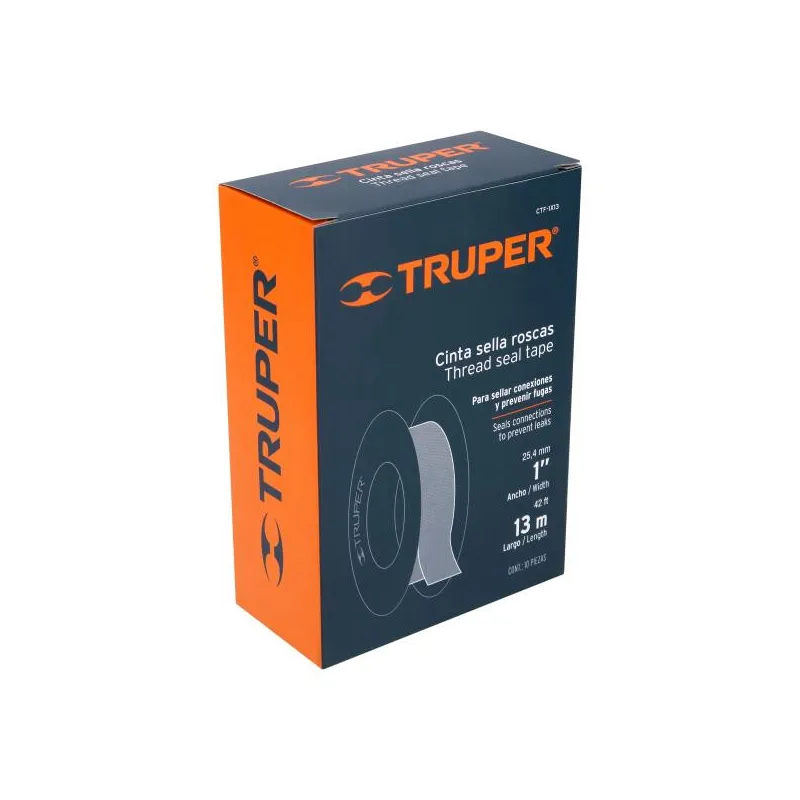 Teflon Sella Roscas 7m Ancho 1" Espesor 0.075mm, Elongacion 12%, Para sellar y prevenir fugas, CTF-1 12511 Truper Fabricadas de teflón No permiten la generación de hongos y bacterias Gran elasticidad De fácil colocación Ideales para sellar roscas de cobre, latón, acero galvanizado, acero inoxidable, aluminio, PPR, CPVC, PVC, ABS y plásticos en general