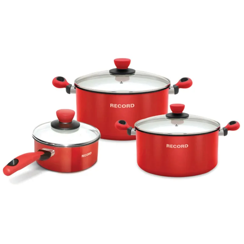 Juego Bombeada 2, 4 Piezas en Aluminio importado Fino acabado tapa roja anodizada, 9304020000 RECORD • Resistentes y durables.• Acabado anodizado brillante interno y externo.• Asas, mangos y perillas de bakelita, aislantes de calor. • Con protector paraflama de acero inoxidable.• Forma bombeada que facilita su limpieza.