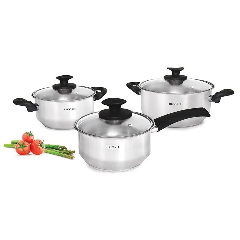 Juego de Ollas Encanto 6 Piezas, en acero inoxidable y fondo termodifusor con tapa de vidrio, 870011003 RECORD