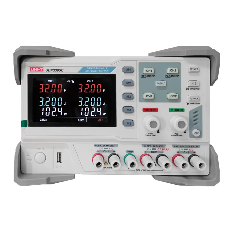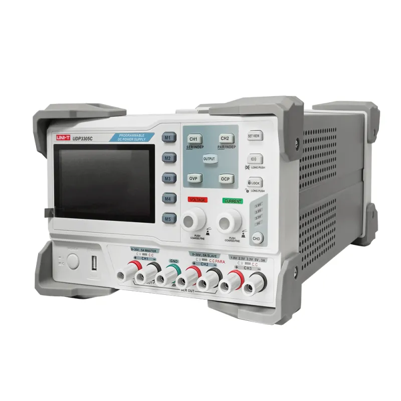 La fuente de alimentación de CC programable de la serie UDP3000 es una fuente de alimentación de CC con control programable y una excelente relación calidad-precio, con un rendimiento excepcional, una salida fiable y una interfaz intuitiva. La fuente de alimentación de CC UDP3305C cuenta con tres salidas independientes: dos ajustables de 30 V/5 A y una fija seleccionable de 1,8 V/2,5 V/3,3 V/5 V/3 A (ajuste preciso). Gracias a los modos de tensión constante (CV) y corriente constante (CC), y a las funciones de protección contra cortocircuitos y sobretensiones, el instrumento cumple a la perfección con diversos requisitos de prueba.