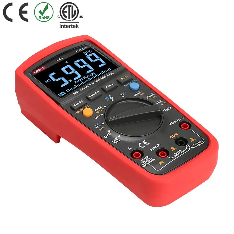 La serie UT139 son multímetros digitales CAT III 600V diseñados para electricistas. Su función NCV puede verificar efectivamente el estado eléctrico mediante la medición de la intensidad del campo EM.  Su barra analógica integrada de 31 segmentos también ofrece a los electricistas una mejor representación visual de los resultados de medición.