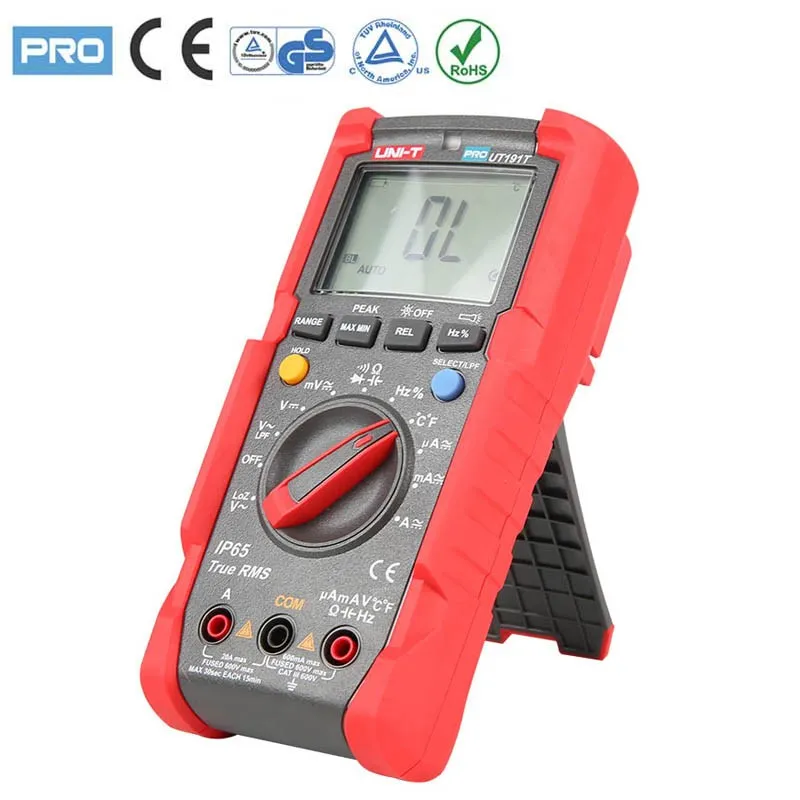 Multímetros profesionales de la serie UT191 diseñados para usuarios industriales. Esta serie de multímetros con certificación CE / GS / cTUVus cumple con CAT III 600V y tiene clasificación IP65, adecuada para su uso en entornos húmedos y polvorientos. La nueva memoria de función de UT191 conserva la configuración del modo más reciente la próxima vez que se enciende, lo que mejora la eficiencia para los usuarios. UT191T admite mediciones de temperatura precisas y precisas.