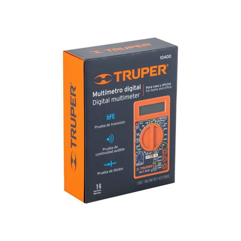 Multitester MUT-39 True RMS 20A UsoGeneral Truper 10402 Instrumento de medición con cuerpo de ABS Escala de circuito integrado con convertidor (alterna / directa) doble integrado como centro y protección contra sobrecargas Funciones: Prueba de diodo, continuidad audible, retención de datos (HOLD), true RMS y apagado automático (APO) Uso general