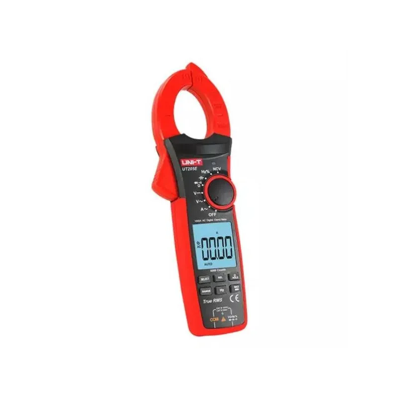 UNI-T UT205E una pinza amperimétrica digital True RMS equipada con pantalla LCD grande de 6000 cuentas. Permite medir el voltaje AC/DC, corriente AC, resistencia, capacitancia, ciclo de trabajo, chequear diodos, probar continuidad de circuitos y detectar el voltaje sin contacto (NCV).