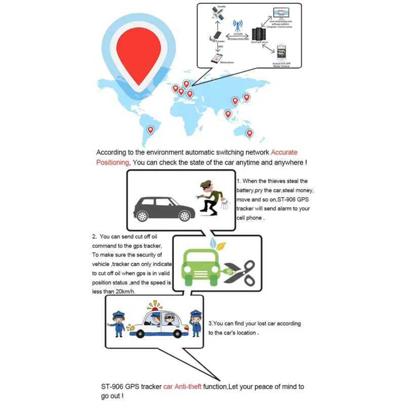 Cuando descubra que el automóvil fue robado, puede enviar un comando de sms para cortar el aceite y la electricidad a través de la plataforma, la aplicación del teléfono o el mensaje.
