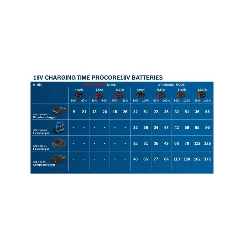 • Tiempo de carga corto, por ejemplo, 55 minutos con el cargador GAL 18 V-160C o 90 minutos con el GAL 1880 CV