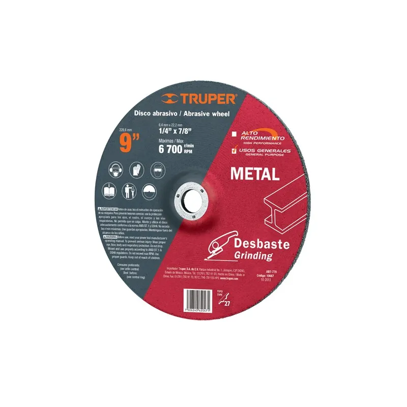 Discos Desbaste 9" x6.4mm Metal Tipo 27, Centro 7/8", Oxido de Aluminio, ABT-779 10667 Truper