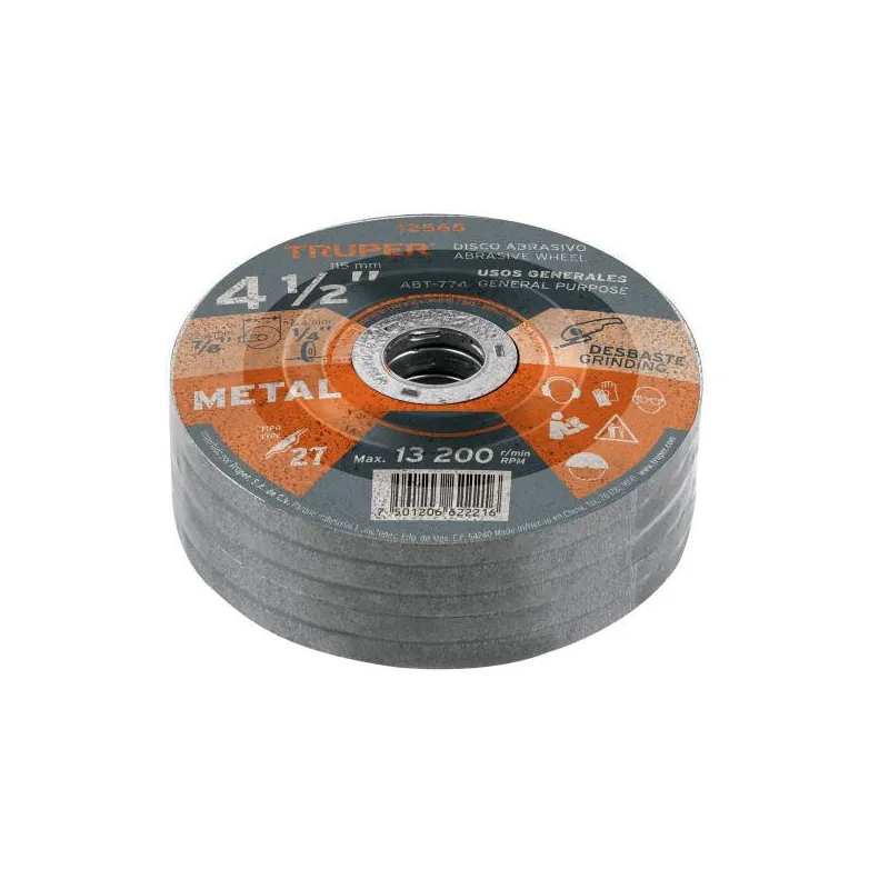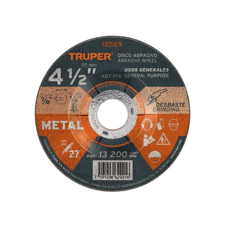 Discos Desbaste 4 1/2" x6.4mm Metal Tipo 27, Centro 7/8", Oxido de Aluminio, ABT-774 12565 Truper