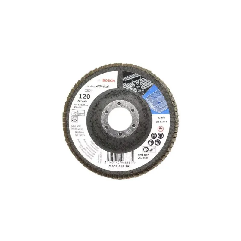 Disco Flap 4-1/2" 115mm G60 Curvo FibraVidrio x421 Bosch 2608619907 Discos de láminas X421 Standard for Metal, versión en ángulo Alta velocidad de eliminación de material y buen acabado El grano de óxido de aluminio es robusto y resistente al desgaste. Te ayuda a conseguir un acabado consistente. La placa de soporte está fabricada de fibra de vidrio.