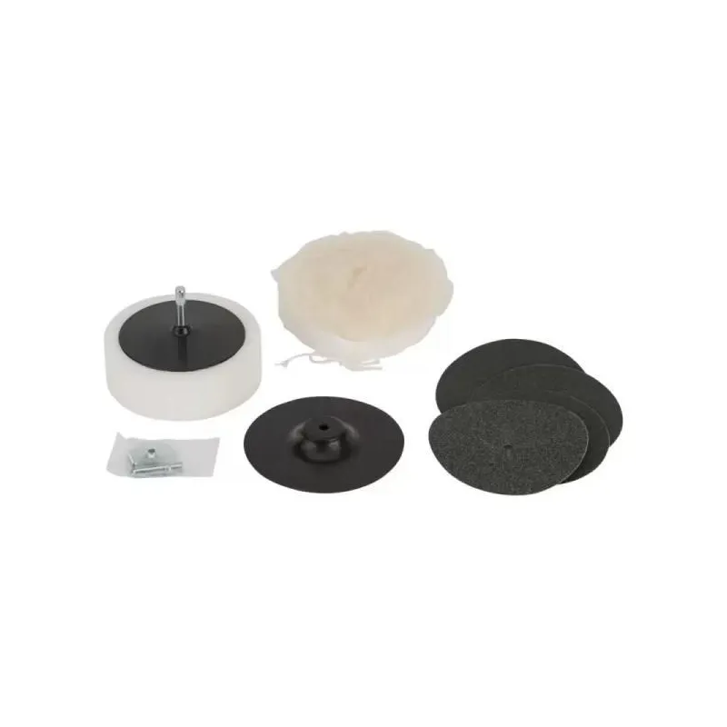 • El set de pulido S24 de 8 piezas sirve para pulir con cualquier taladro estándar con un diámetro de portabrocas mínimo de 8 mm. Tiene un diámetro de plato de soporte de 125 mm y se puede utilizar a una velocidad máxima de 4.500 rpm.