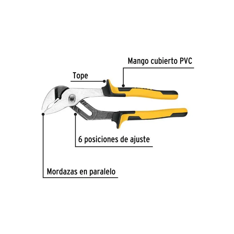 Alicate Picoloro 10" Aislado 1000V ConfortGrip 5Ajustes Truper 13068 Fabricada en acero al cromo vanadio, 2X más resistente al desgaste que las de acero al carbono Acabado niquelado gris, 3X más resistente a la corrosión Aísla hasta 1,000 voltios de corriente alterna Mango ergonómico con topes que evitan el deslizamiento de la mano Mordazas en paralelo...