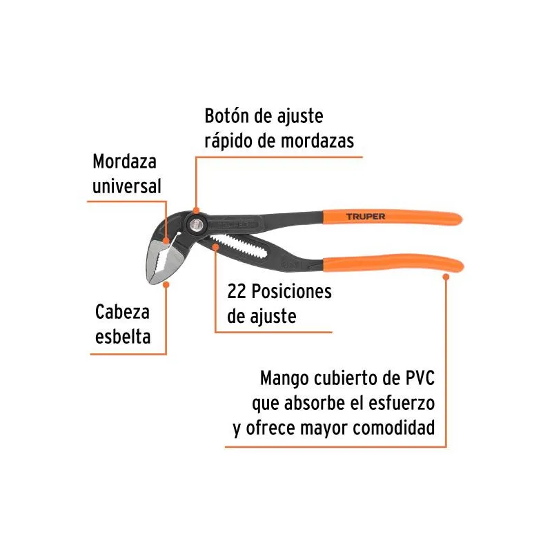 Alicates Pico Loro 10" Europeo Acarbono MangoPVC Truper 102483 Fabricada de acero al cromo vanadio, 2X más resistente a la corrosión Cabeza esbelta ideal para zonas de difícil acceso Acabado pulido para fácil limpieza Mango cubierto de PVC que absorbe el esfuerzo y ofrece mayor comodidad Mordaza universal que permite sostener múltiples geometrías, agarre...