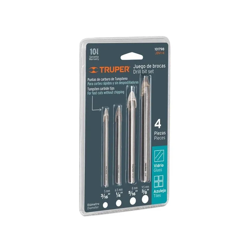 Juego de Brocas para Vidrios y Azulejos 4 Piezas Carburo de Tungsteno Truper 101798