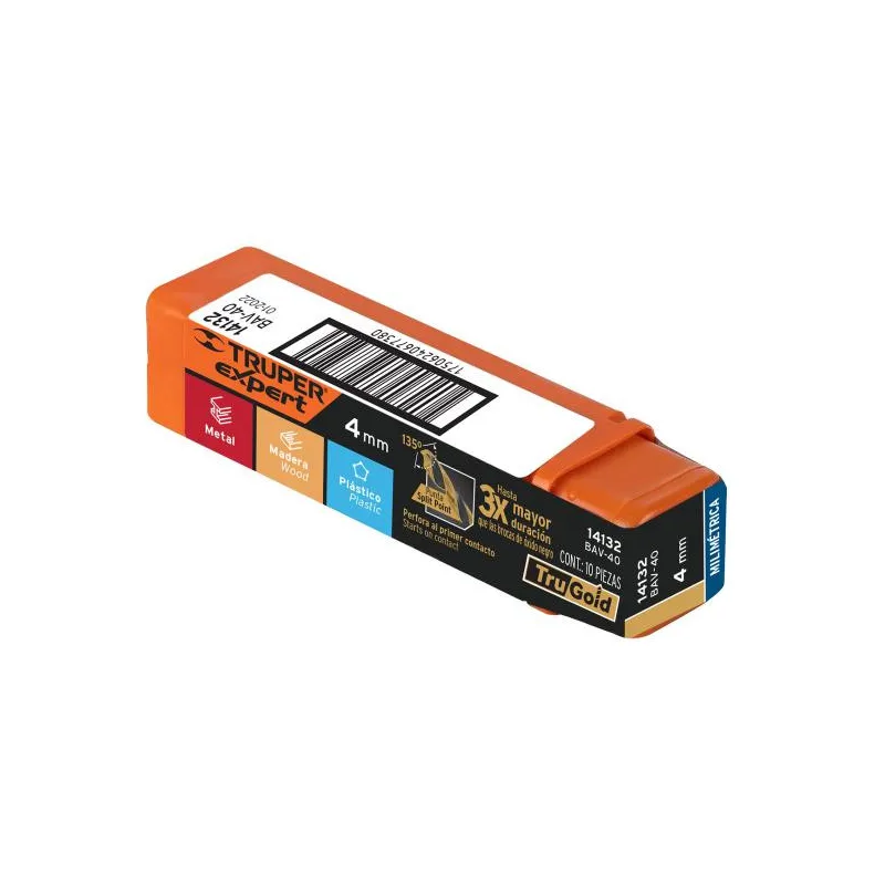 Brocas Metal HSS 12mm xL151mm Truper 14333 Punta Split Point autocentrable para perforaciones más rápidas y precisas 30% Mayor vida útil que óxido negro Ángulo de punta 135° Diámetro marcado en láser para fácil identificación Broca nitrurada al vacío que previene la oxidación