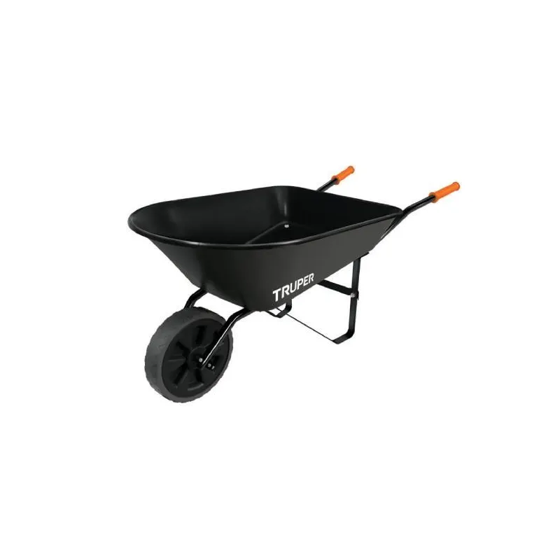 Carretillas 5.5 ft3 750kg Super Reforzado Calibre18 Imponchable, Truper 100416 Llanta imponchable suave y ligera de poliuretano con rin 3 aspas, brinda mejor amortiguamiento en terrenos irregulares y mayor estabilidad Concha de lámina calibre 18 (1.21 mm) Bastidor tubular calibre 14 (1.9 mm) con grips antiderrapantes Tacón estabilizador Uso industrial