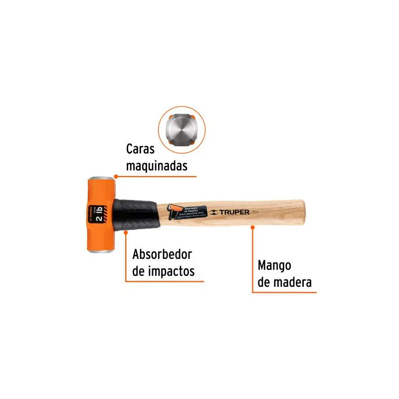 Combas Octagonales Cabeza 16 lb Mago 36", Cara Maquinada con protector termoplastico, MD-16M 16515 Truper - Cabeza forjada en acero alto carbono con doble tratamiento térmico- Caras maquinadas y biseladas que reducen la posibilidad de accidentes por esquirlas- Mango fabricado en madera de encino estufado, encerado y laqueado- Protector termoplástico que...