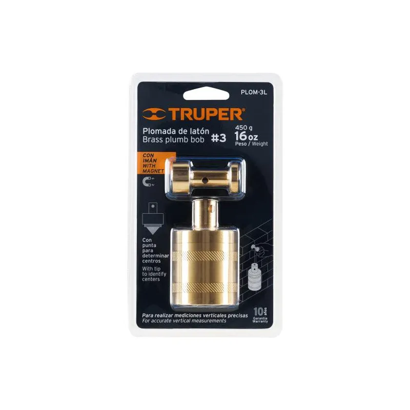 Plomada de Laton con Centro 582g, Para Uso en plomeria y construccion, PLOM-4L 17069 Truper Cuerpo de latón sólido con acabado pulido Punta para marcar y determinar centros Carrete (compás) para alinear perpendicularmente al piso, castillo, paredes, ventanas, puertas, etcétera Ideal para realizar mediciones verticales precisas