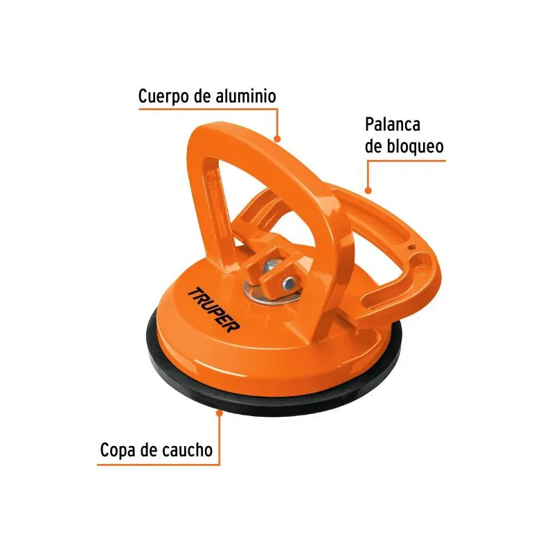 Ventosas de aluminio para vidrio 3 copas de succión Truper 100762 Cuerpo de aluminio reforzado con tres copas de caucho Palanca de bloqueo para asegurar o liberar la succión Fácil manejo de objetos lisos Ideal para formato extragrande, para levantar o mover materiales lisos como vidrio, plástico, mármol, azulejo, panel de metal, losetas y otros elementos