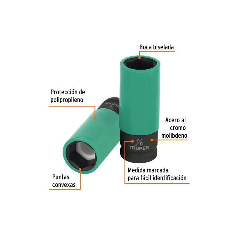 Dados 13/16" E1/2 Impacto Tubulares Hexagonales Con Polipropileno Truper 100928 Fabricado en acero al cromo molibdeno con acabado fosfatado resistente a la corrosión Sistema de sujeción Truper-Drive con puntas convexas que aseguran y aumentan el torque sin dañar tuercas ni cabezas de tornillos Protección de polipropileno que evita rayaduras a la...