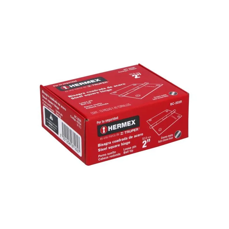 Bisagra cuadrada de acero cromo mate 2" Cabeza redonda Tipo capuchina Espesor 1.5mm Incluye pernos, BC-203R 43254 Hermex