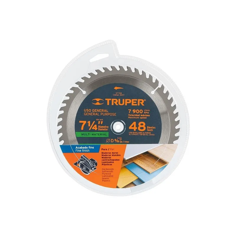 Disco de Sierra 7-1/4" 48Dientes C5/8" Plastico Madera carburo de tungsteno, Truper 18317