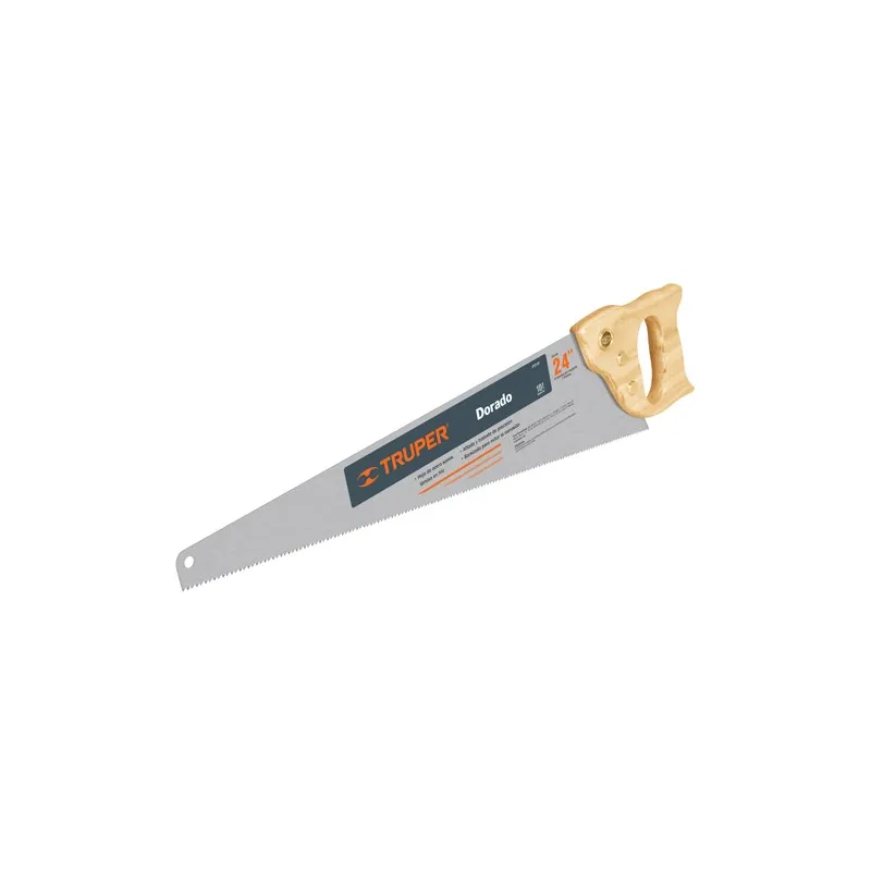 Serrucho Dorado 18" Espesor 0.8mm, DPP 9 en acero alto carbono templado, STD-18 18167 Truper Hoja fabricada de acero alto carbono SAE 1050 templada y pulida para una larga vida Dientes con ángulo de 60°, afilables y con protector plástico para su almacenaje y transportación Mango de madera suave con sujeción de 3 puntos Barreno en el extremo de la hoja...