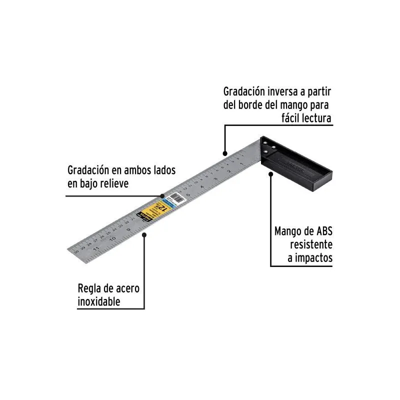 Escuadra Profesional 12" Toolcraft TC0834Escuadra profesional de 12 PulgadasRegla acero inoxidableGraduación en bajo relieve en pulgadasNo incluye accesorios adicionalesUso: profesionalMango de aluminio robustoEscala métrica y en pulgadasPermite realizar mediciones rápidas y precisasMedida: 12" (305 mm)Ideal para trabajos de carpinteríaContenido: 1 pieza