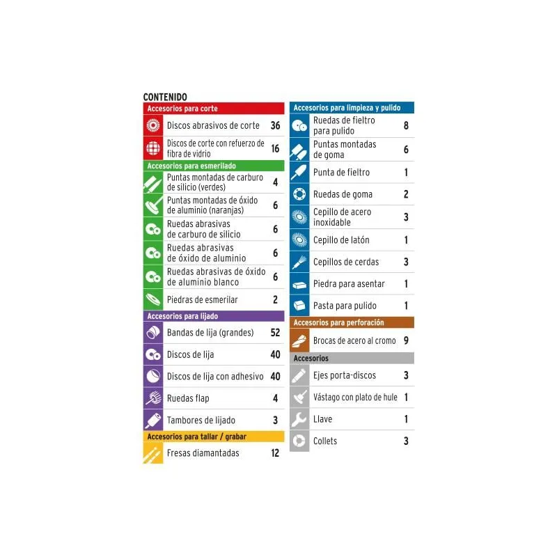 • 16 Discos de corte con refuerzo de fibra de vidrio