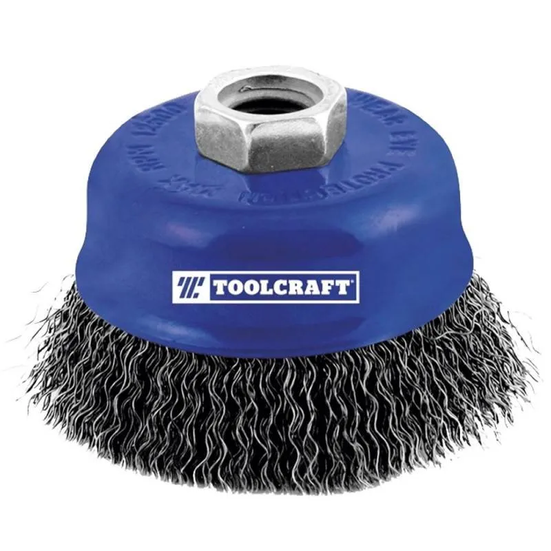 Para limpieza de superficies, para esmeriles de banco, uso profesional, copa rizada, velocidad de 600 RPM, empaque blíster, diàmetro de 3", diàmetro de las cerdas 0.35mm, calibre de 0.35