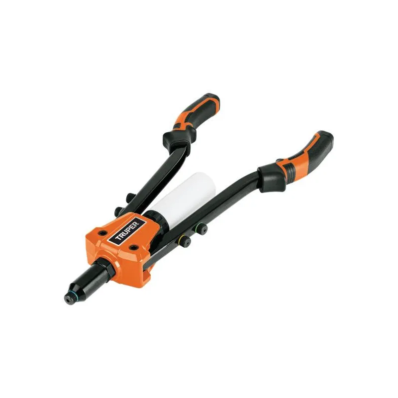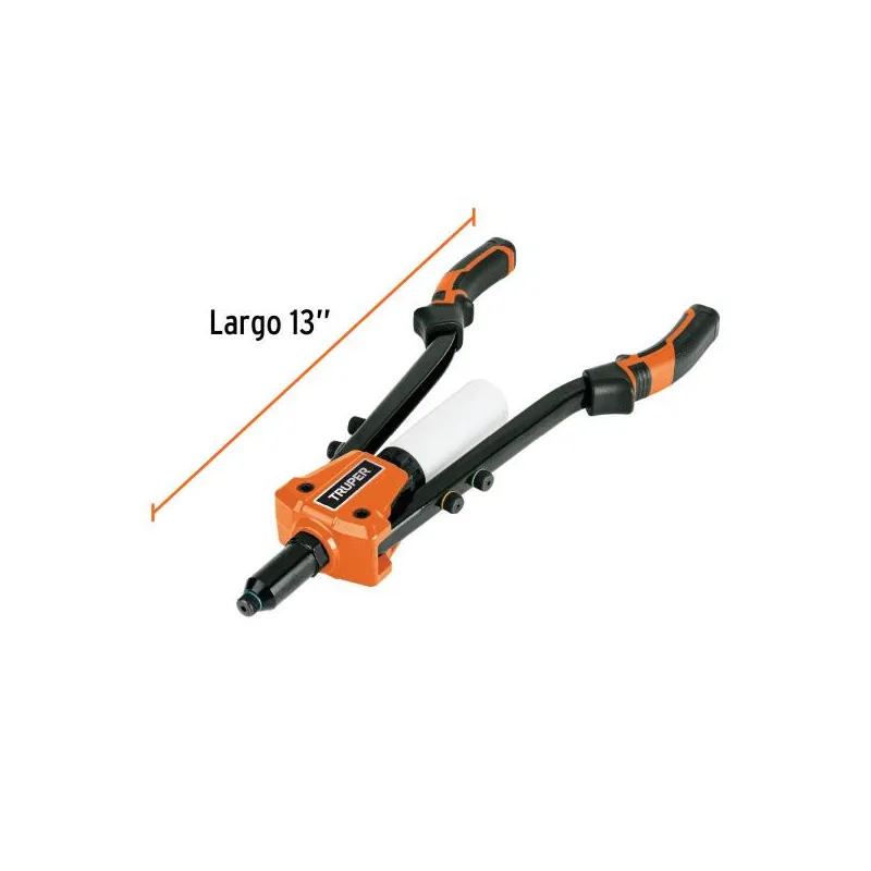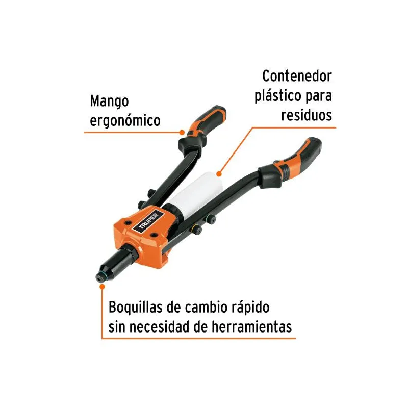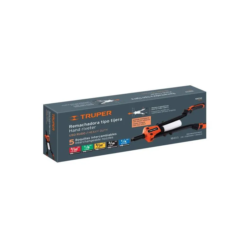 Remachadora 8" Profesional 4Boquillas Truper 100333 Cuerpo de aluminio y mango ergonómico antiderrapante de PVC 4 boquillas de cambio rápido sin necesidad de herramienta para remaches de 3/32", 1/8", 5/32" y 3/16" Ideal para trabajos en metal, reparación de canaletas y trabajos automotrices Sistema de presión ajustable para remachado Fácil mantenimiento