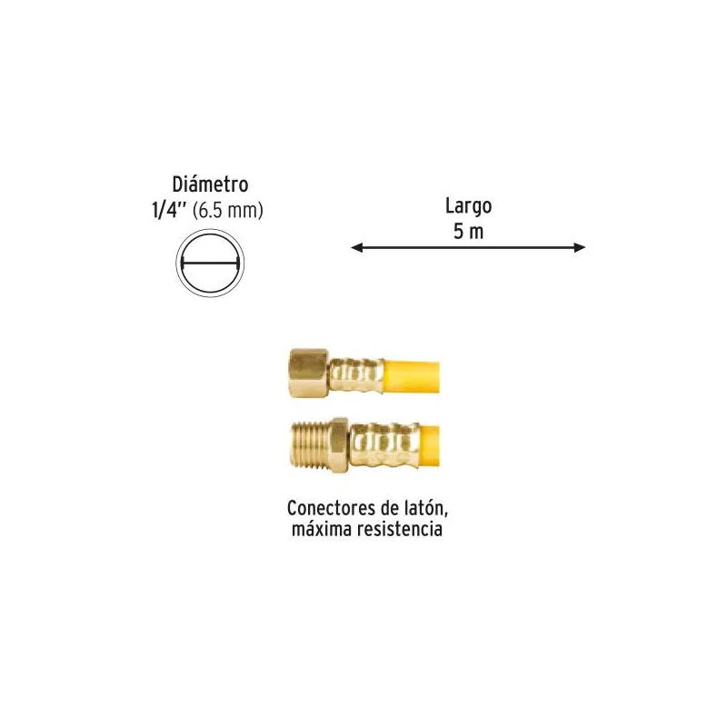 Manguera para compresor de Alta Presion de Hule 1/4" Conector Movil 15 m, MAN-AP-15-1/4 17081 Truper Presión máxima 300 psi Conexiones de latón, 1/4" NPT, hembra y macho (con refuerzo) Manguera reforzada y trenzada 3 capas evita deformación o grietas Manga antitorsión evita rupturas y reducir desgaste Resiste a la abrasión, aceites, y grasas