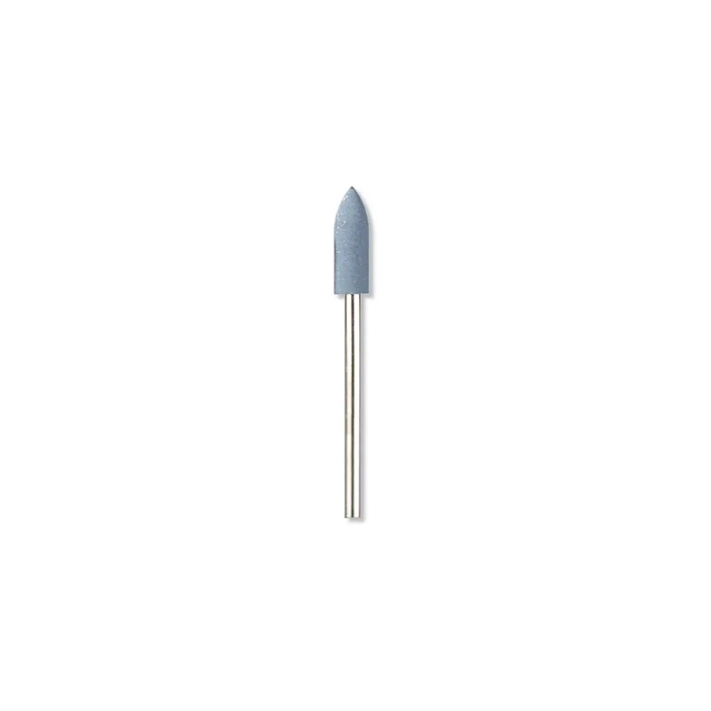 Accesorio pulidor con punta redondeada fabricado con goma azul y abrasivos para eliminar rebabas pequeñas y marcas de rayones en metales ferrosos.