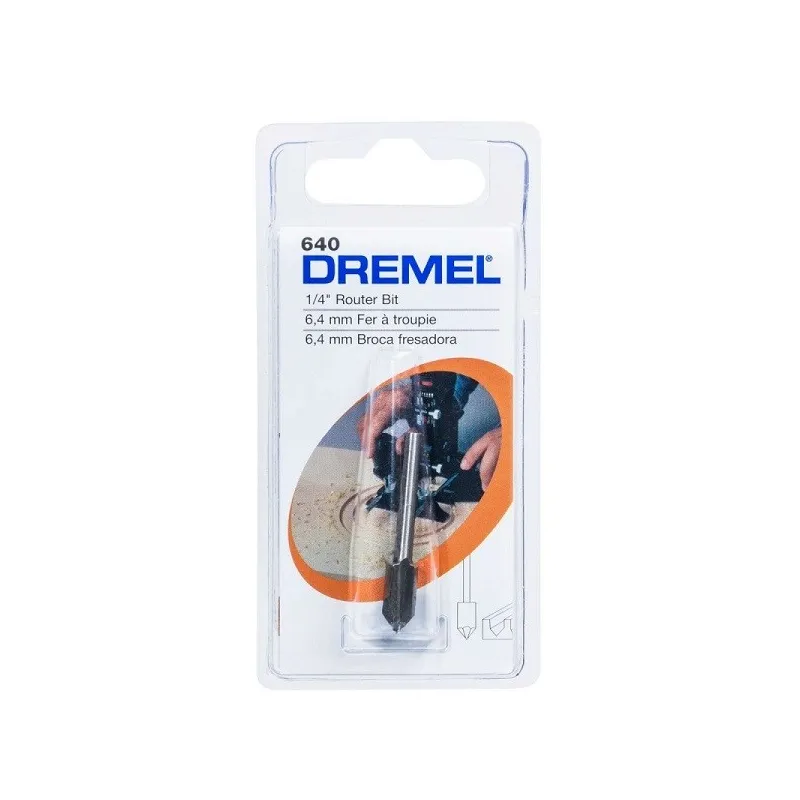 Broca de Fresadora Dremel 640, 1/4" 6.4mm en V" Ruteado Fresado, Para fresar, incrustar y mortajar en madera y otros materiales blandos. Se utilizan con los aditamentos para fresadora Nº 230 y 330 Dremel® y con la mesa para fresar Nº 231. Hechas de acero de alta velocidad